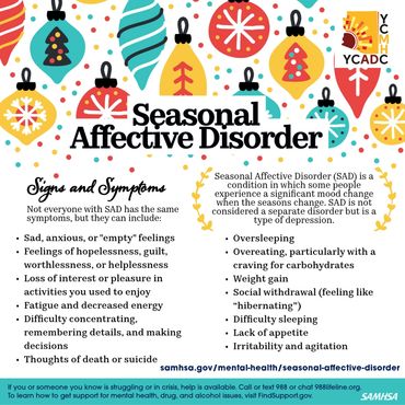 Is it just the 'winter blues' or seasonal affective disorder (SAD)? Learn the signs and symptoms of SAD, a type of depression, and how to get help. Reach out to someone to speak about what’s weighing on you. You can also call or text 988 or chat 988Lifeline.org
