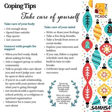 The holiday season can be filled with joy and celebrations. This time of year can also trigger difficult emotions, thoughts, or behaviors—which can affect your mental health and use of substances (including alcohol). Let your friends, family, and communities know that confidential support is available 24/7 for both mental health and substance use.